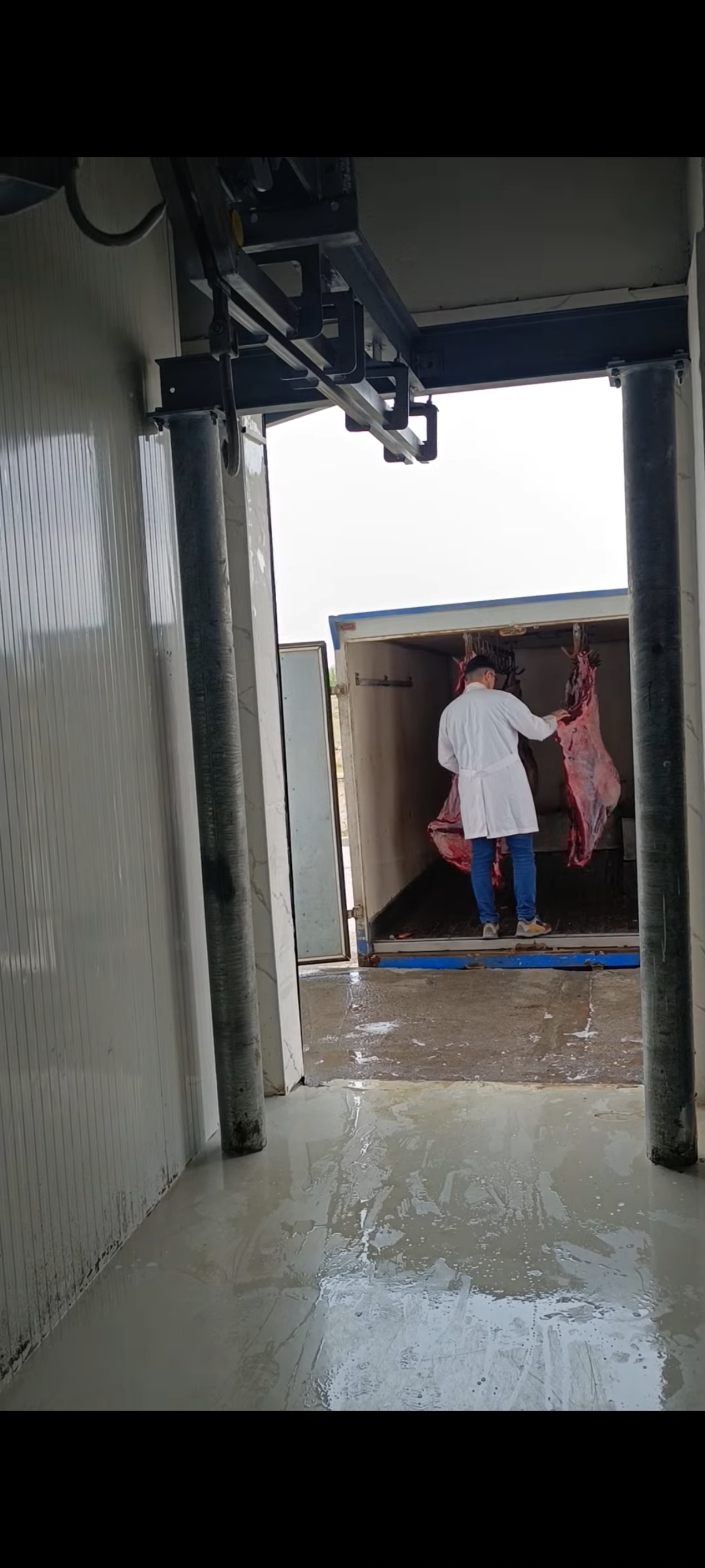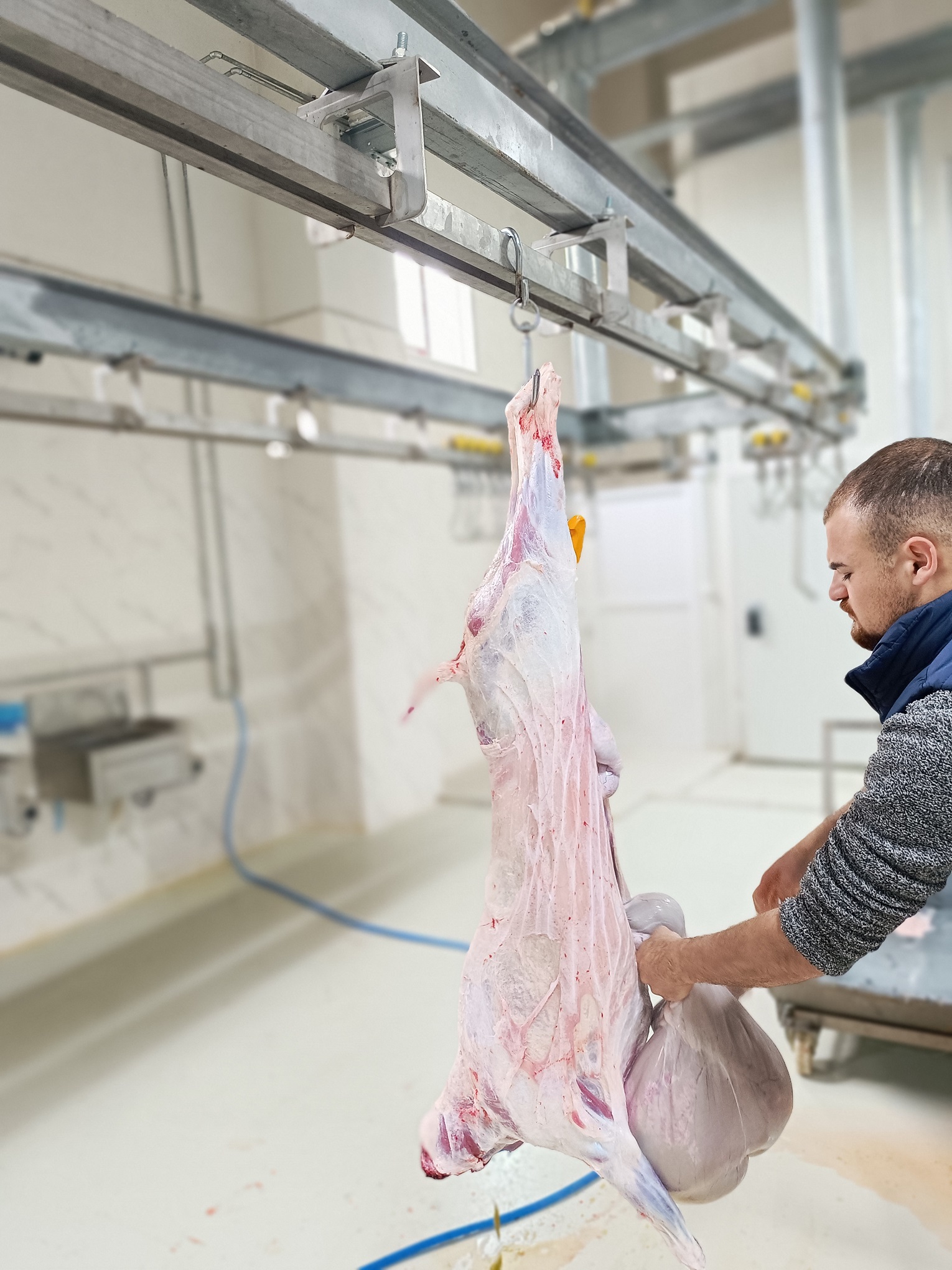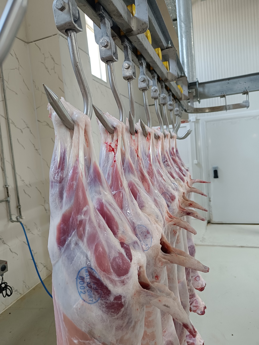 Fotoğraflarda da görüldüğü üzere, tesisimizde kesim sonrası karkasların askıya alınarak uygun soğuk zincir koşullarında muhafazası sağlanmakta; veteriner hekim kontrolü altında sağlık muayeneleri ve mühürleme işlemleri eksiksiz olarak yapılmaktadır.
